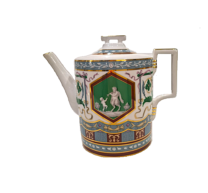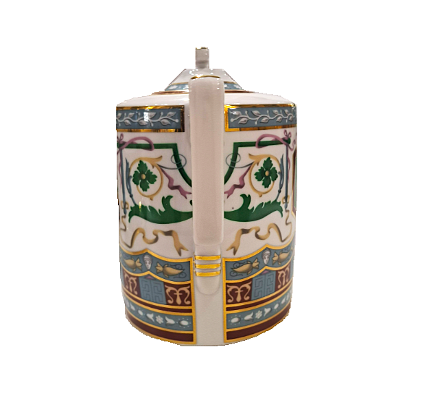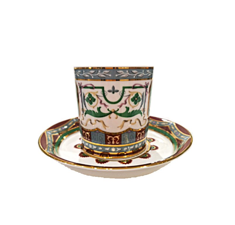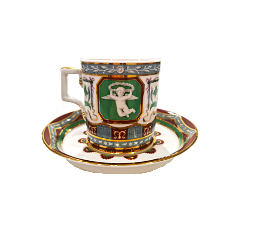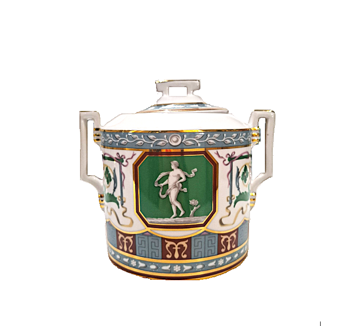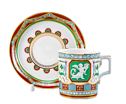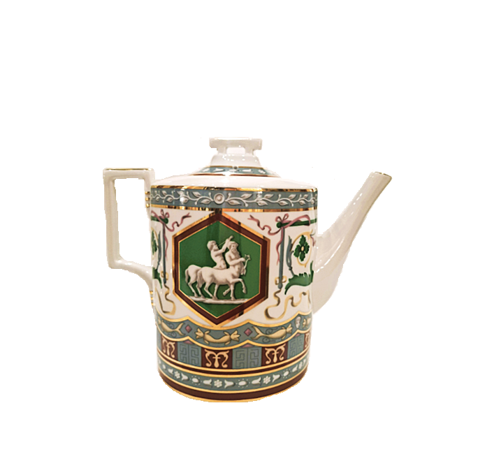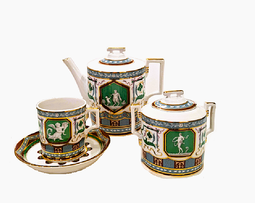 Императорском Фарфоровом Заводе из классического твердого фарфора. Форма отливается вручную. Для декорирования используется надглазурная деколь. Форма "Гербовая" восстановлена по музейному образцу. Рисунок "Античный" выполнен по мотивам музейного образца знаменитого "Рафаэлевского" столового ансамбля, который был заказан на ИФЗ в 1883 году Александром III, и назван так по орнаменту, скопированному с рисуноков знаменитой галереи, сооруженной в началне XVI в Ватикане во дворце Папы Римского, по проекту архитектора Д.Браманте. Выпуск изделия начался в 2017 году.Фарфор.