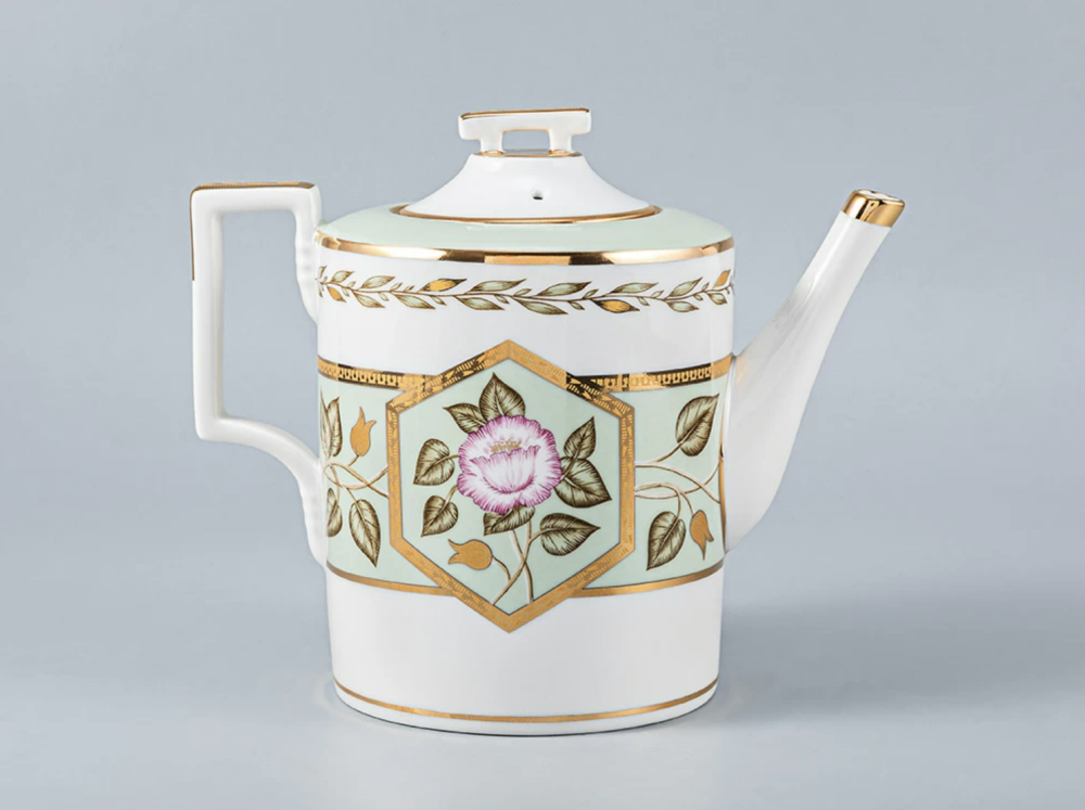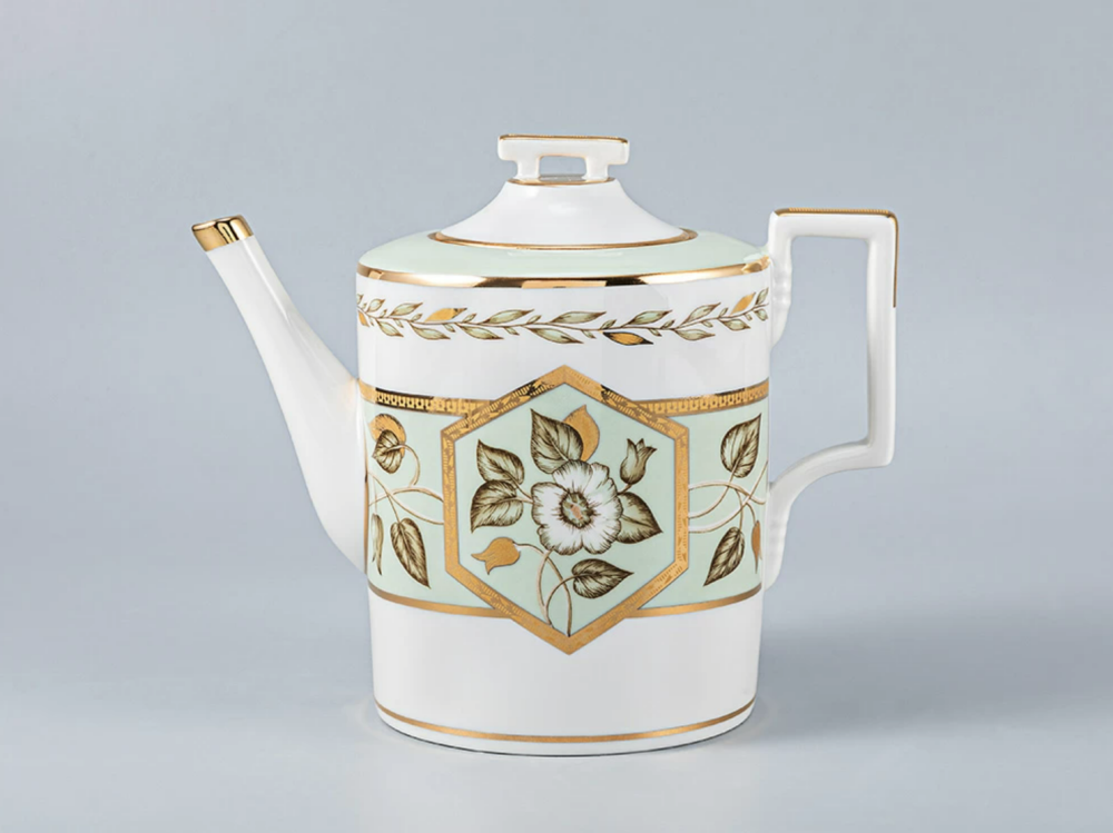 Твердый фарфор. Чайник заварной  Нефритовый фон изготовлен на Императорском фарфоровом заводе из твердого фарфора с элементами ручной росписи. Автор рисунка - Леввович Л.Г. Объем изделия - 1000 мл.