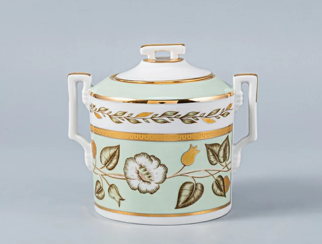 Сахарница рис. Нефритовый фон изготовлена на Императорском фарфоровом заводе из твердого фарфора с элементами ручной росписи. Автор рисунка - Леввович Л.Г. Объем изделия - 400 мл.